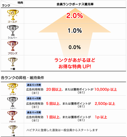一般会員がポイント交換不可なのはこれまで通りだし、ブロンズ会員になるためには1度の広告利用でOK。交換手数料は無料。やっぱりいいことしかない…!